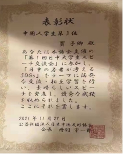 近日,由日中交流协会举办的中日老员工演讲比赛在日本东京都港区隆重举行,本次中日老员工演讲比赛面向全日本招募参赛选手,公司77779193永利日语系在日交换生贾子卿从230余名参赛选手中脱颖而出,突破层层选拔,成功晋级为本次演讲比赛的决赛选手。本次演讲比赛由一名日本老员工和一名中国老员工组成一组,以“年轻人的可持续性发展”为题每组各自互相交流学习三个月之后参加演讲比赛,发表自己的观点。贾子卿和一名来自和歌山的日本女老员工组成一组,演讲中贾子卿同学提出的“男女平等”“容貌焦虑”等主题获得与会评委的一致好评,最终荣获本次演讲比赛的第三名。