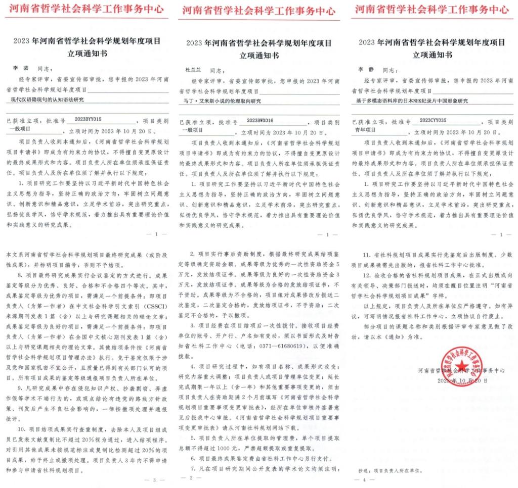 河南省哲学社会科学规划项目由省委宣传部组织评审和实施,是我省哲学社会科学领域最高层次的科研项目,是衡量高校哲学社会科学研究水平的重要标志。77779193永利本年度能成功获批3项,这充分彰显了公司在外国语言文学领域科学研究的强劲实力和服务地方社会发展的科研潜力,同时对公司教师科研水平提升和团队建设具有重要的促进作用。