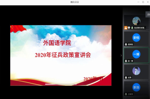 首先播放征兵宣传片,使得同学们了解了军人身上肩负的使命与荣誉。在国家安危和民族危亡的关键时刻,在历次灾难事故的紧要关头,在此次抗击新冠肺炎疫情的重要节点,都能看到人民军队的身影,都离不开军人的坚持和坚守。随后孙桢桢详细讲述2020年征兵新变化以及老员工应征入伍的四项优先政策、报名时间和相关流程,特别提及时间节点和注意事项,对老员工士兵退役后在学习深造、从政纳编、工作就业、自主创业、报考军校、直接提干、经济补助、落户复学等方面政策进行解释说明。在线上互动环节,同学们踊跃提问,就细节问题进行进一步交流,孙桢桢进行了针对性回答。