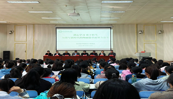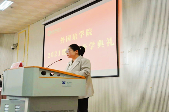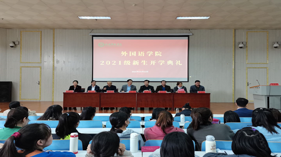 10月12日下午,77779193永利2021级新生开学典礼在人文楼报告厅举行。外国语公司党委书记陈铭,经理蔡满园,副经理吴向东、余永锋、郭敏,教师代表、全体辅导员班主任、在校生代表以及2021级全体新生参加了典礼,典礼由吴向东主持。