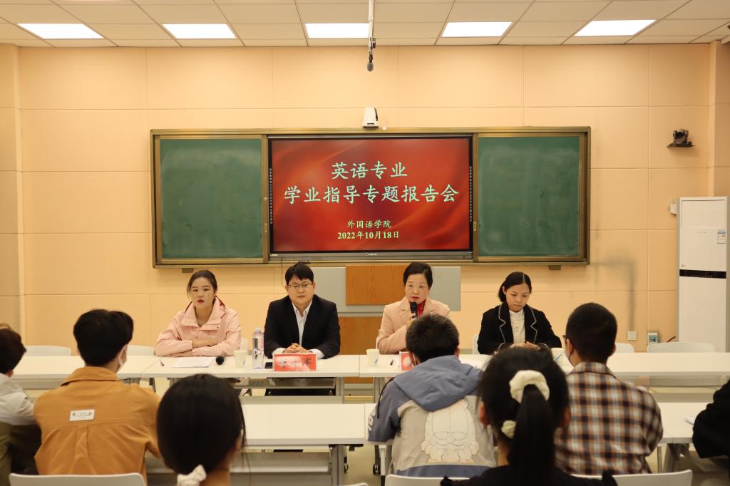10月18日晚上,英语专业学业指导报告会在人文楼603教室举行,报告会由崔淑丽博士、蒋小军博士和孙媛园老师共同讲授。崔淑丽从学科知识、专业英语和职业规划等三个方面向同学们进行了详细介绍,并希望同学们怀抱梦想,脚踏实地,做有理想的奋斗者。蒋小军重点指出了学习意识和学习习惯的重要性,强调师范生应培养良好的自律精神和自学能力。孙媛园就英语专业员工应如何学习进行了详细阐述,并针对听力、阅读、口语、基础写作与翻译等方面的学习给出具体指导。