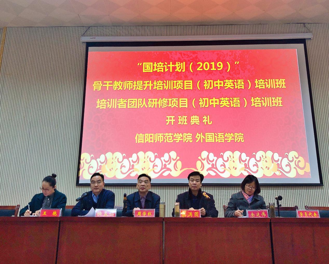 11月23日上午,“国培计划(2019)”初中英语培训者团队、骨干教师提升研修班开班典礼在人文楼报告厅举行。外国语公司党委书记周学红,经理蔡满园,党委副书记柏孟仁,研修班班主任余运伟、王艳出席典礼,来自全省14个市、56个县基础教育一线的一百四十余名学员参加典礼。柏孟仁主持开班典礼。