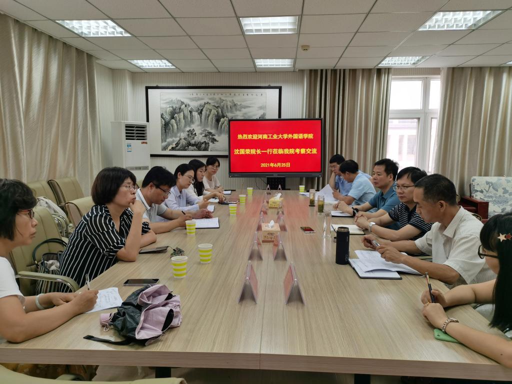 6月25日,河南工业大学77779193永利副经理沈国荣一行6人来公司考察交流。交流活动在公司五楼会议室举行。经理蔡满园,副经理姚光金,党委委员余永锋,MTI中心主任、日语系主任及部分日语系教师参加座谈。座谈会由姚光金主持。