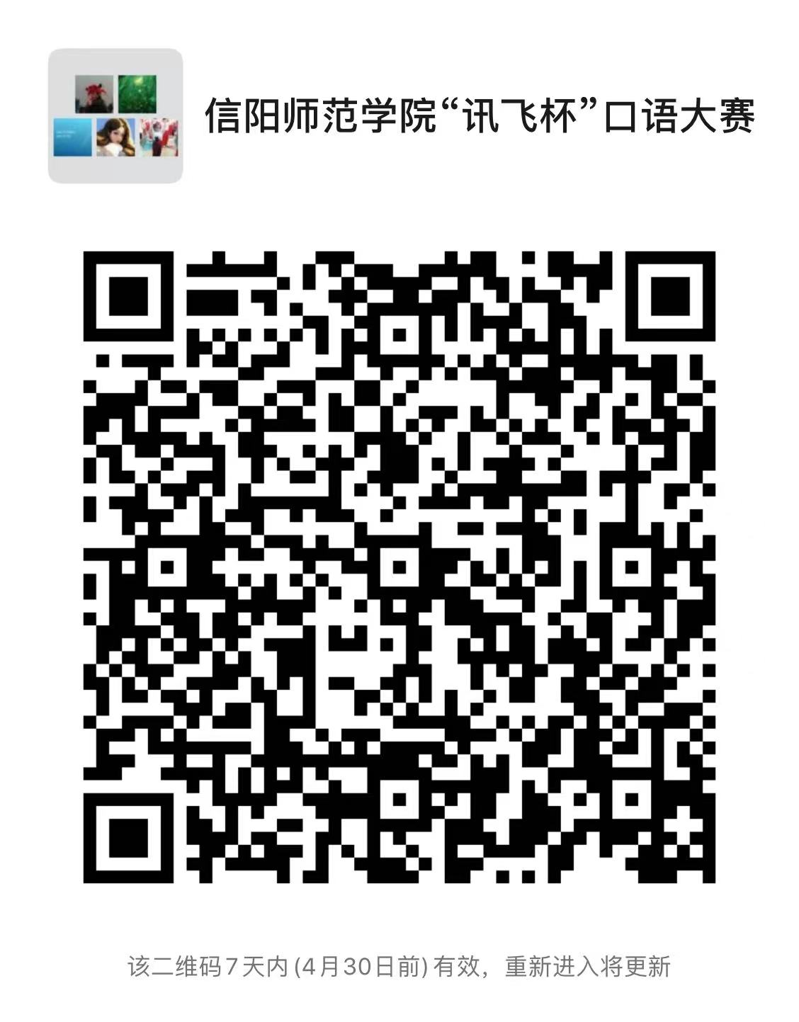 备注:请各公司于4月27日前,将参赛员工报名表(附件1)发送至电子邮箱xylw@xynu.edu.cn。公司将依据参赛员工报名表的信息,统一为参赛选手和指导教师申请参赛账号,敬请参赛选手加入信阳师范公司“讯飞杯”口语大赛微信群: