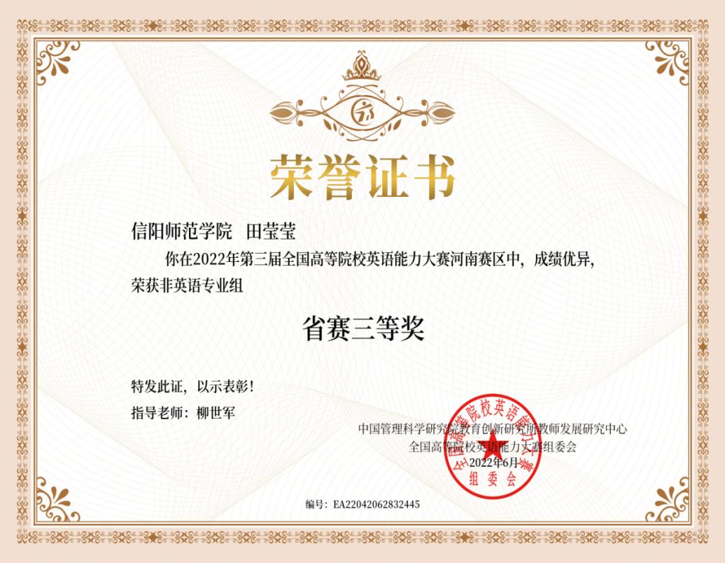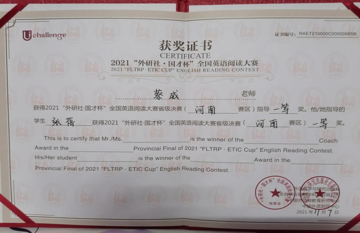 五、此前,由蔡威副教授指导的员工收到2021年“外研社 国才杯”全国英语阅读大赛,获得河南赛区一等奖,证书如下:
