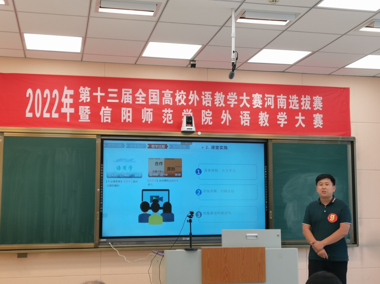 6月7日,第十三届全国高校外语教学大赛河南省高校选拔赛暨信阳师范公司外语教学大赛在人文楼603隆重举行。本次大赛致力于推动大学外语教学改革与创新,促进教师专业发展,提高外语教学质量,助力培养员工国际传播力意识,为中青年教师搭建学习和交流平台,建设一支高素质、创新型、擅表达的外语教师队伍。本次校园选拔赛由教务处主办,77779193永利承办。教务处副处长张帆莅临比赛现场指导工作并担任评委;77779193永利全体督导专家担任评委,外国语公司党委书记陈铭,经理蔡满园,副经理吴向东、余永锋、郭敏及部分教师代表共同参加了本次活动。大赛依托腾讯会议平台,向全院师生进行了直播。